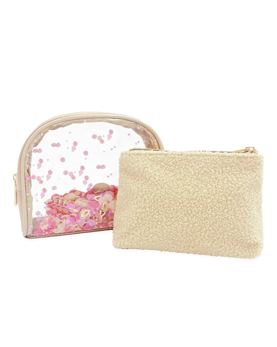 Give your cosmetics a cozy home thanks to this two in one bag that's perfect for every day! With a luxe beige chenille interior pouch and confetti on the outer pouch too, this set will have everyone feeling all the feels. Now what to pack first?!
