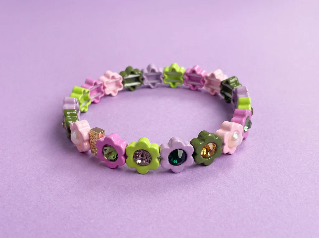 Get ready to smile every time you glance at your wrist! This delightful flower bracelet bursts with cheerful pink, green, and purple blooms, each crowned with a gleaming stone centerpiece.
