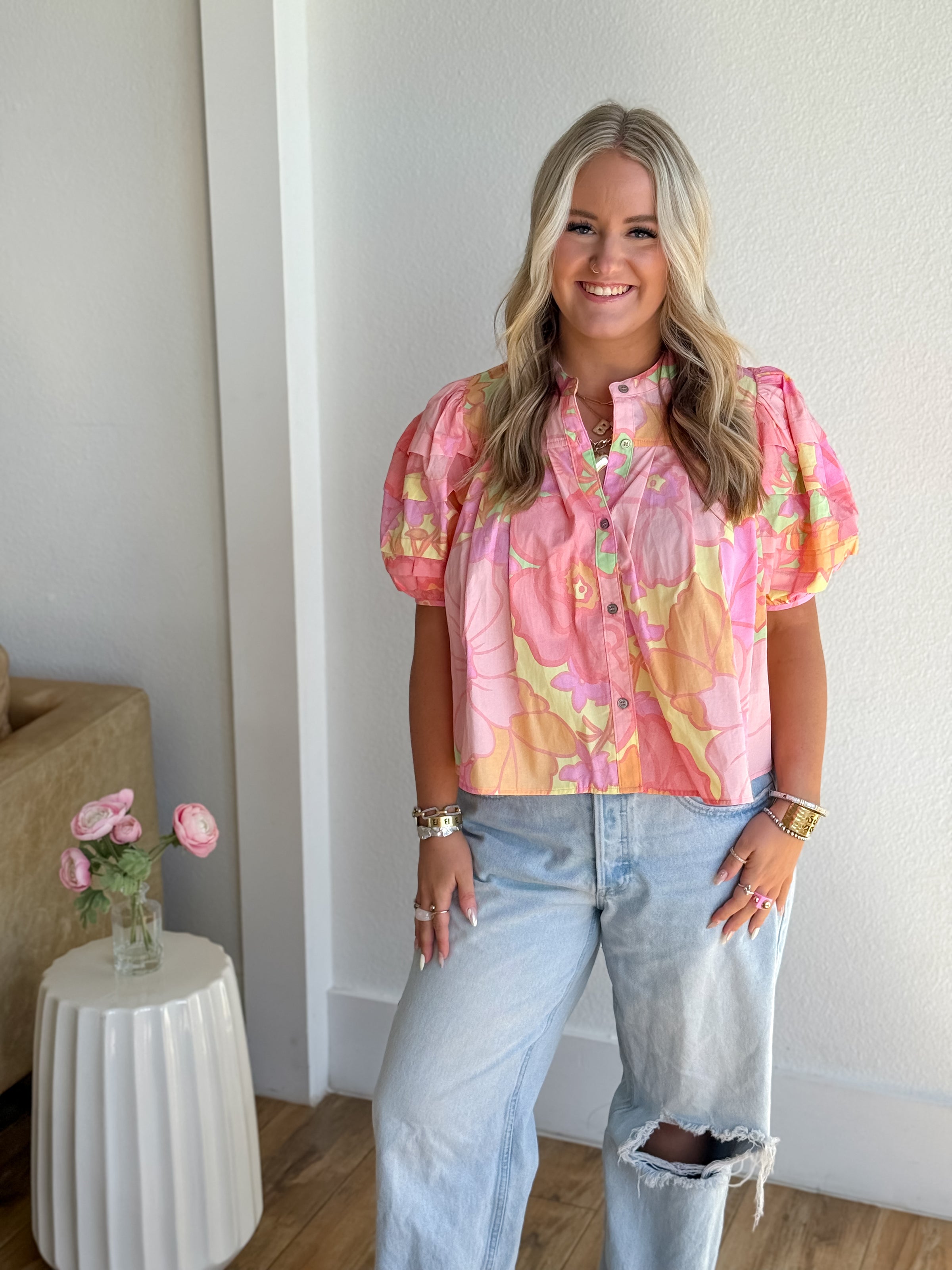 Back another year but in a HOT color shceme! We are in love with this precious pastel swing top! This Karlie Top features big, beautiful flowers, pleated puff sleeves and an oversized swingy fit!