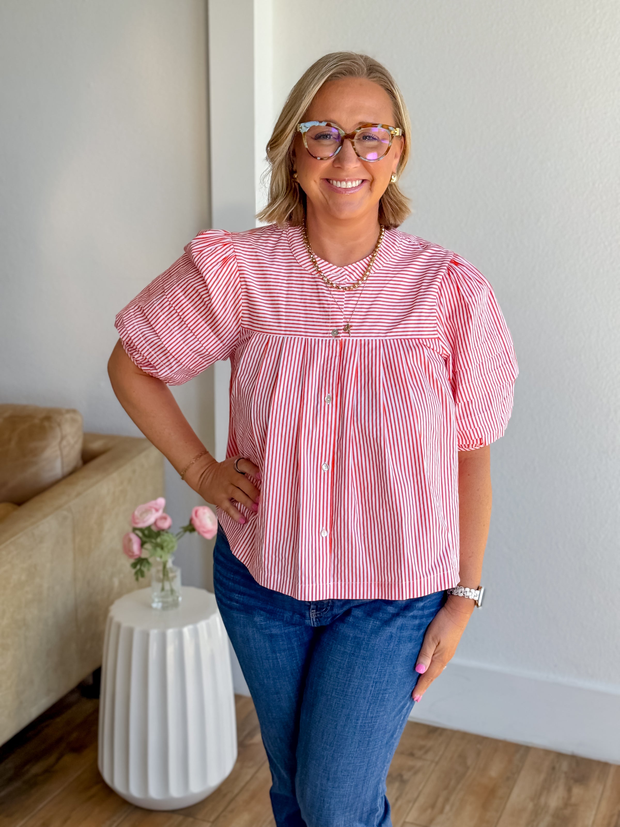 The Orange Crush Top is a timeless striped essential with subtle puff sleeves and functional button detailing. Perfect for layering or wearing solo, this simple silhouette works effortlessly from casual weekends to relaxed workdays. The classic stripe pattern pairs with warm orange tones for a versatile piece that complements any wardrobe. Lindsey is in the large