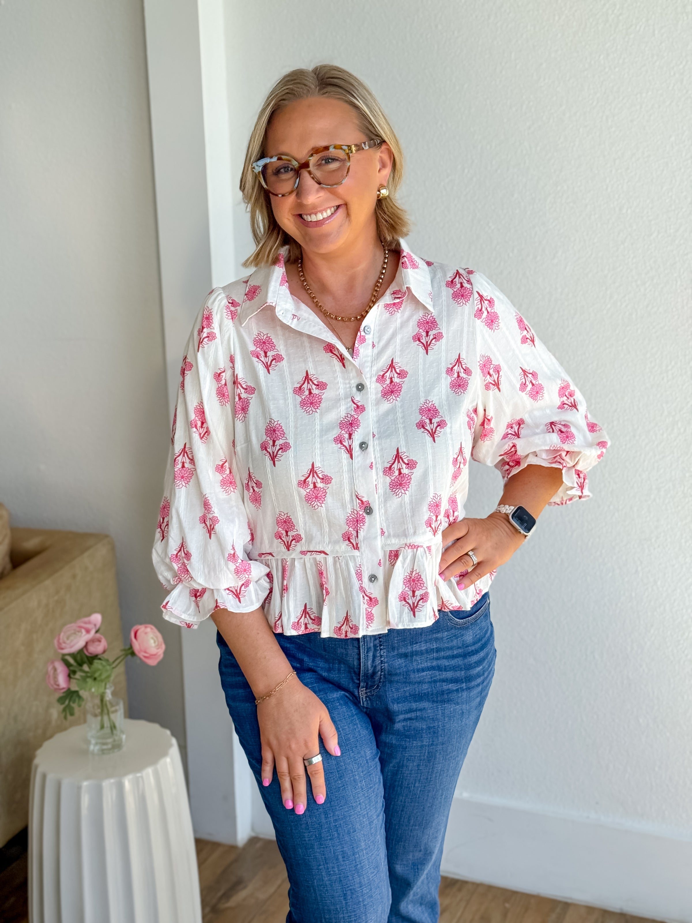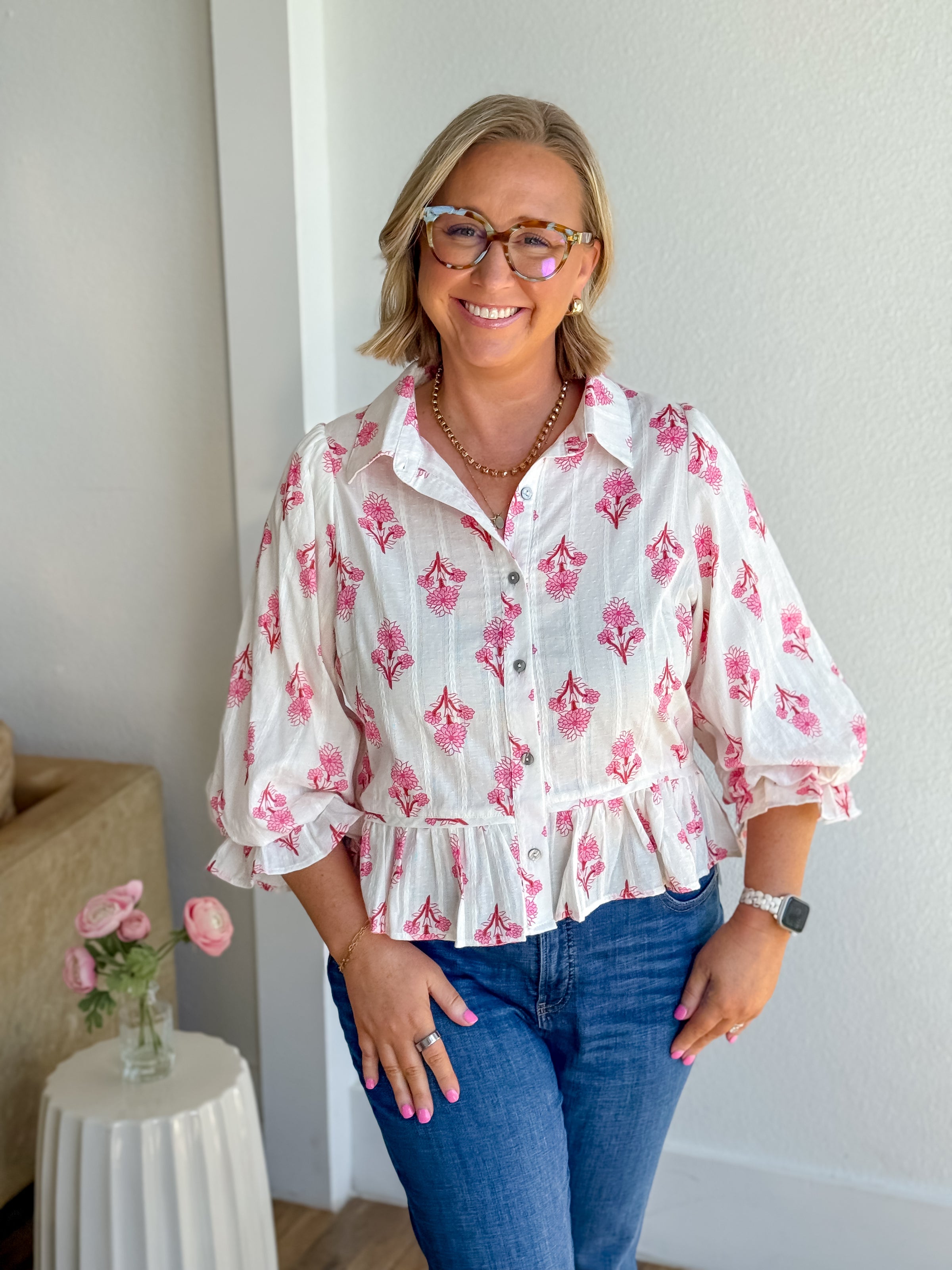 Discover timeless elegance with the Prim & Proper Top. This botanical print beauty showcases romantic 3/4 puff sleeves and a charming peplum hem that flatters every figure. The crisp collared neckline and front button closure deliver classic sophistication, while elasticated sleeve cuffs ensure a comfortable, tailored fit. Made from lightweight, non-sheer woven fabric that's unlined for breathability, it's the perfect piece for spring and summer styling. Dress it up or down with ease.