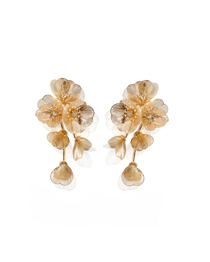 The Audrey Gold Statement Earrings are a bold, elegant floral design that makes an unforgettable impression. Measuring 86mm long x 48mm wide, these cascading flowers are crafted with intricate petal detailing and finished with sparkling rhinestone centers for a touch of glamour. Their lightweight construction ensures comfortable wear while still delivering a dramatic statement, making them the perfect accessory for both formal occasions and standout everyday style.